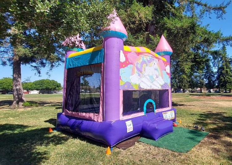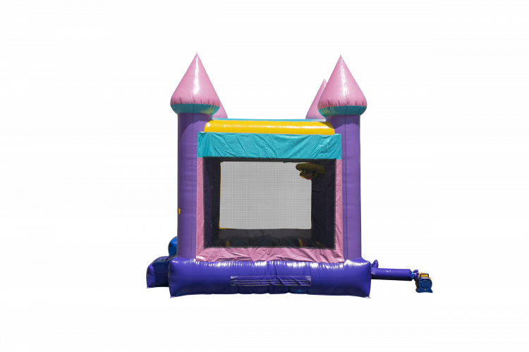 Our Dazzling Pink and Purple bounce house is the perfect way to combine fun and healthy activity. It features ample jumping area and a basketball hoop. Choose a complementary Art Panel from our collection to match your occasion. The bounce house has 360-degree mesh windows, so parents and spectators can have a clear view of all the fun. It's made safe and secure with lite n strong™, fire-resistant vinyl.