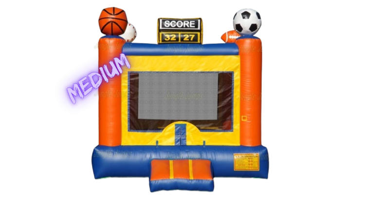 Our 13x13 Sports Arena bounce house is perfect for your little athletes and sports enthusiasts. Each corner features an inflatable sports ball, and right above the entrance flap is a simulated scoreboard. Large screened-in openings keep air flowing and let spectators observe the fun inside.
