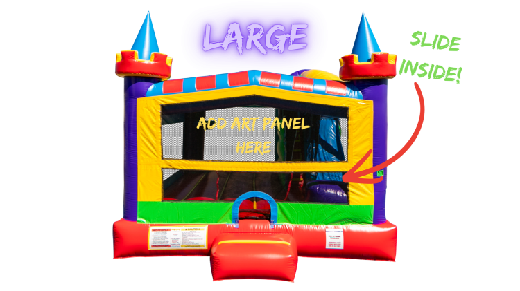 This 4-feature challenge is jam-packed with fun, offering a spacious jumping area, basketball hoop, climb and slide. Inter-changeable art panels featuring your favorite, timeless characters and themes, adds versatility and ‘play value'! Made with fire resistant vinyl, this combo offers high-visibility mesh around all sides allows spectators to view easily. The slide inside will keep the kids "contained" while parents and guests socialize!