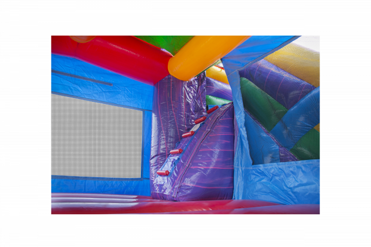 This Module Combination brings an atmosphere of splendor and creativity to any event. Its beautiful and cheerful colors appeal to all tastes. This combo comes with a basketball hoop, stairs, slide and a stopper for dry use. Perfect for backyard parties and summer camps. The external slide will help regulate the number of jumpers inside.